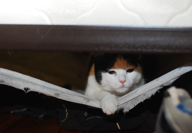 Psycho killer kat continues to live in Zack’s mattress. The box spring has a hole in the bottom so she scurries around in her secret hiding place and lashes out if you walk to near. She’s started intimidating the dog, running up to it and banging her claw on the ground. Juneau thinks she wants to play so I’m afraid for her eyes getting scratched. Meanest cat ever.